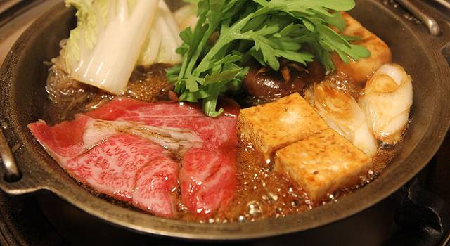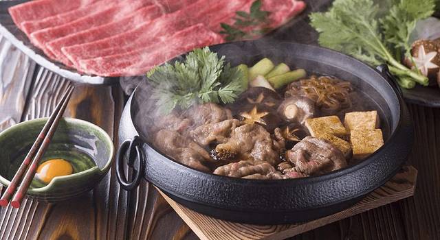 锅料理在江户时代就有记录,多用蔬菜的汤汁做底料,口感微甜。吃时蘸鸡蛋,牛肉裹上鸡蛋液口感更加细腻。有两种吃法,关西风少汤汁,是将牛肉煎熟后加入酱汁;关东地区直接将肉菜泡在汤里煮