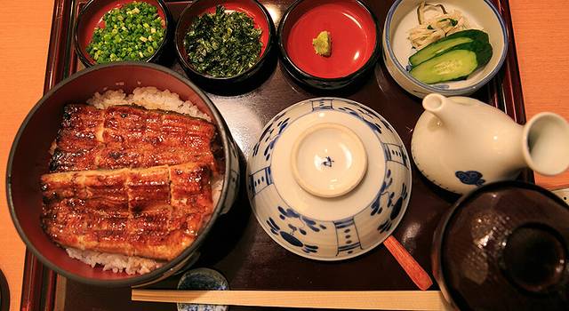 鳗鱼饭从江户时代流传至今,是最经典的盖浇饭之一。烤鳗鱼有关东和关西两种做法,一般有三种吃法:直接吃享受最原始的滋味;加上紫菜葱花芝麻拌着吃;倒入高汤变成经典的日式茶泡饭