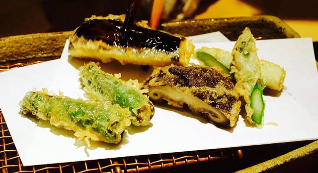 在日式菜点中,用面糊炸的菜统称天妇罗,其原型是一种名叫花园小鱼的葡萄牙食品。天妇罗挂很薄的糊,炸后可看见包裹的原料,面衣酥脆,而里面的食材爽口多汁。每个季节都会有时令天妇罗