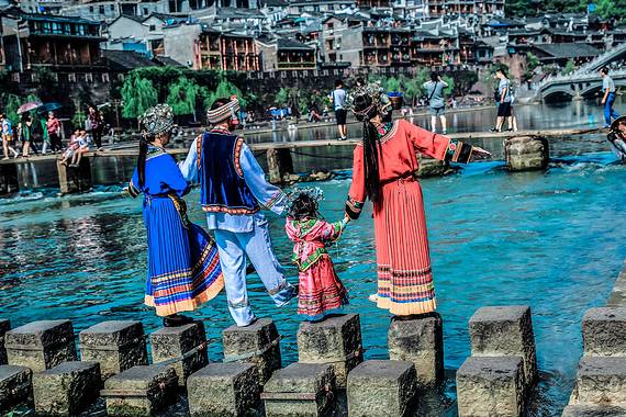 凤凰古城的标志性地标,白天是游客的集散地,夜晚就是当地人的跳舞场
