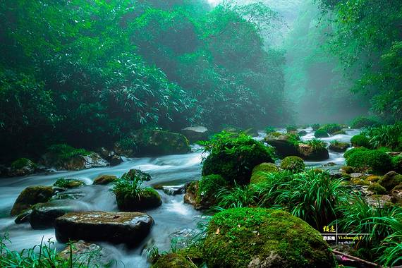 巍峨挺拨,雄伟壮观,森林苍翠,溪水晶亮透明,瀑布垂直飞泻,气势夺人