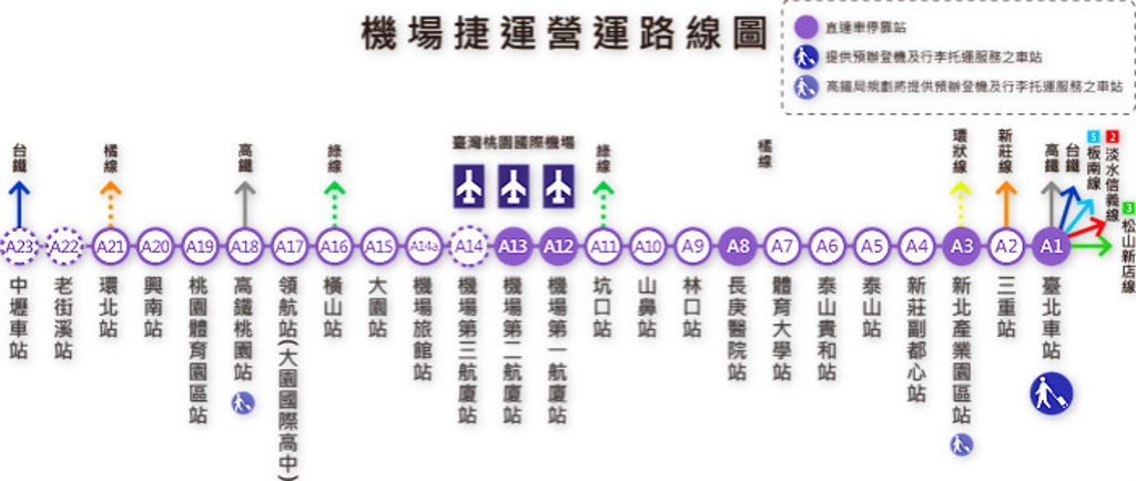 桃园机场捷运,由台北车站往南,经过桃园国际机场至桃园中坜市。全长51公里,全线设有22个车站。待完全兴建后,台湾桃园国际机场捷运系统将串联国际机场至高铁车站、台铁车站及台北捷运系统,形成一个四通八达的复合运输系统;由A1站(台北车站)至台湾桃园国际机场,约仅需35分钟。