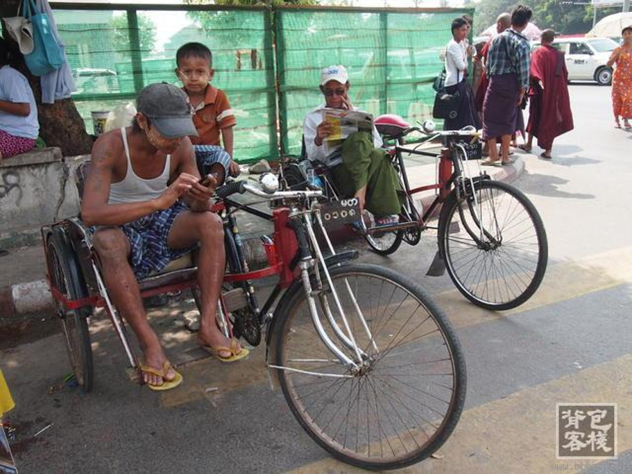 在仰光,摩托车和自行车都被禁止上主干道,在一些小巷还有人力车来来往往地拉客,这种人力车是合法的。车的座位在右侧,可供两人背对背乘坐,因为仰光路况差,人力车一般只去一公里以内的地方,可拉人也可运货,价格大概为500~1000缅币。