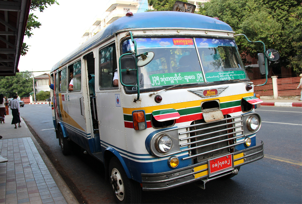 仰光的公交车都是私人在运营,基本上都是二战时日本淘汰下来的旧车,已远远超过了报废年限,非常不安全,有些车载满人后严重往一边倾斜。公交车的方向盘在右边,行驶道路也在右边,而上下车的车门却在靠近马路的左边,所以非常危险。此外,仰光公交车上没有阿拉伯数字,没有英文报站和站牌,只有缅文数字。总体而言,不推荐初来者尝试。公交车票价从100至500缅币不等。