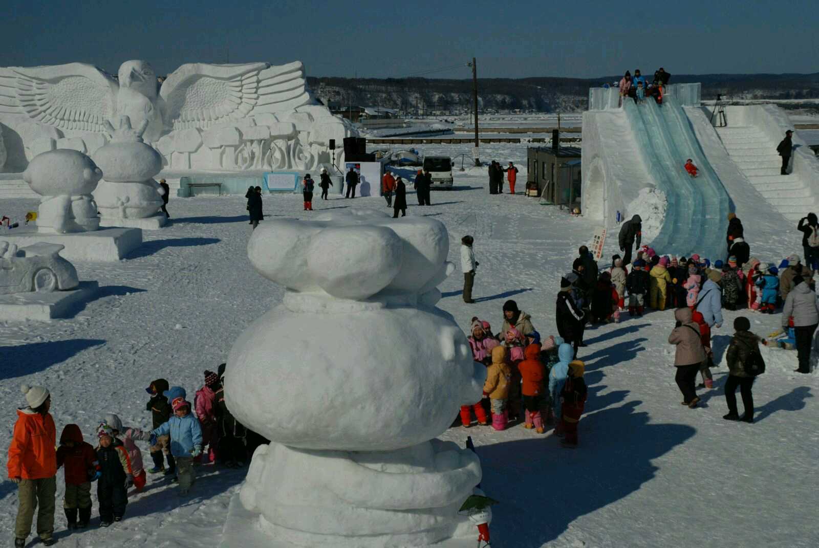 2月上旬,网走会举办鄂霍次克海流冰祭,在观看壮观的流冰同时,海港边会堆满各种冰雪雕像。