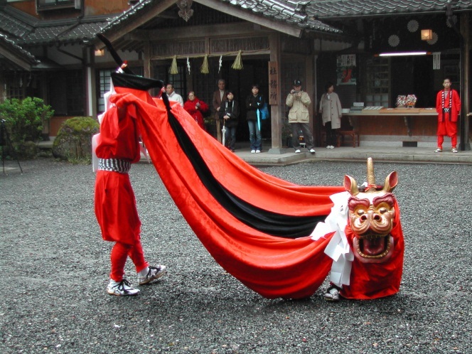 泽神社的麒麟狮子舞(澤神社の麒麟獅子舞)始于江户时代初期,历史悠久,是鸟取县的非物质民俗文化财产,每年开演两次,一次是在4月的第二个周日举行的春祭上,另一次则是在10月第二个周日举行的秋祭上。以红色为主色的麒麟狮子舞极具日本传统特色。