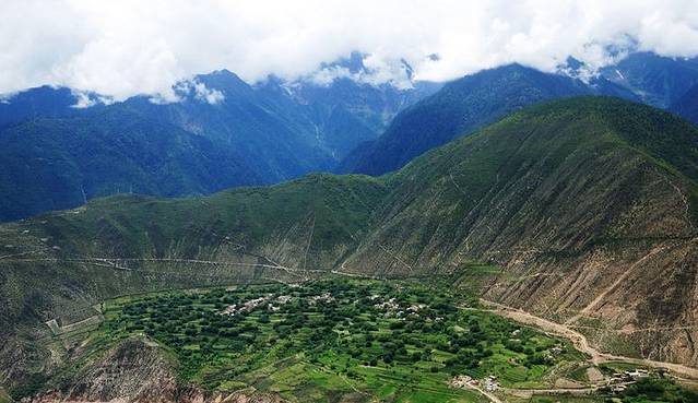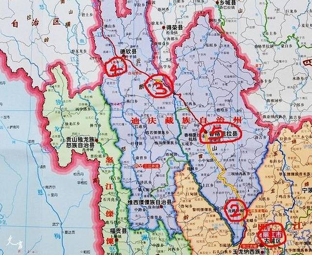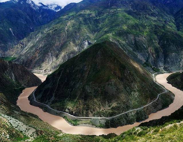 位于云南省迪庆州德钦县奔子栏镇和四川省得荣县子庚乡交界处,当地人称为月亮湾。围绕锥形山体的那条路就是从香格里拉通往稻城亚丁的公路。