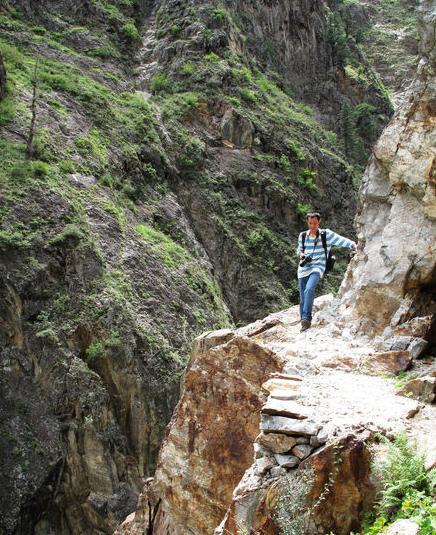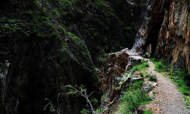 这条山路的唯一亮点就是路窄而险峻,左边是峭壁,右边是悬崖。在这样的山路上行走,谁都会小心翼翼。我不时担心头上的石头会掉下来,所以仰完头就赶紧往前走。行走的时候不自然的就把身体重心向山体一边倾斜,也真正体会到了看景不走路,走路不看景的深刻含义。路边几乎没有任何遮挡的植物,路边就是悬崖,所以这条路不接待胆小的、恐高的、走路不正常的。