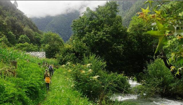 过了这片庄稼地,就回归到正式的徒步小路上。路边就是由融雪汇聚而成的雨崩河,最后汇入到澜沧江。