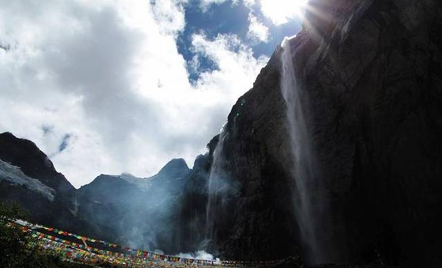 神瀑高数百米,由雪融化的水流汇集而成,山上垂下如哈达般千丝万缕的水线,飞驰而下,落入地面,溅沫飞扬,震耳欲聋。 站在离神瀑数十米远的地方就能感受到水气带来的寒冷,加上一身汗更添几分凉意。藏族人以到雨崩神瀑下沐浴作为一种洁净心灵的修炼。看着三五成群的藏民来此沐浴,心中顿生感慨。
