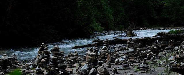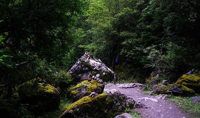过了神庙,一路的原始森林通往神瀑。高原的原始森林别有一翻特色,厚厚的青苔诉说着年代的久远,河边的玛尼堆让人心生温暖,这一块块的小石头承载了多少人的祝福与祝愿。