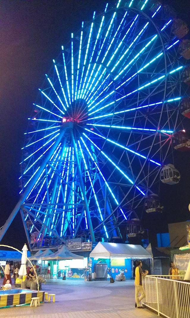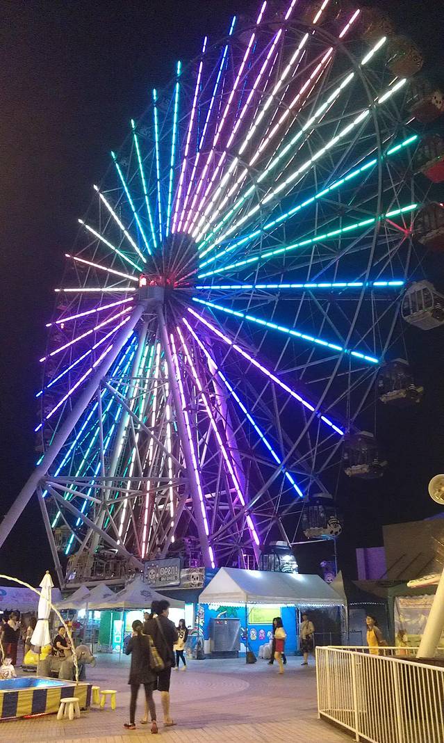 从爱河之心返回后驿捷运站乘捷运到凯旋下车,1号出口出站就可以乘坐免费的接驳车到梦时代购物中心!进入梦时代直接乘电梯到顶楼就可以乘坐摩天轮了,买票后在入口处会有工作人员帮你照相留念!这个摩天轮车厢都是卡通人物的,我们选择了我们喜欢的卡通人物!这里看高雄的夜景非常好,上面还会有讲解的哦!注意注意,在车厢运行到3/4时会提示把脸靠近车厢侧面的车窗,会拍照的哦!到出口时可以自己选择照片装订成册,背景都是摩天轮的哦!很漂亮!摩天轮门票150nt,照片是175nt!ps:这里是海派甜心的拍摄地哦!