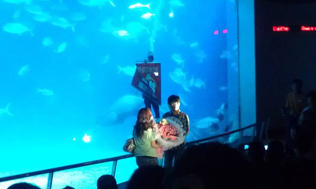 海生馆,门票450nt,用青壮卡优惠价350nt,也是来到台湾费用仅次于101的一个景点。来到海生馆感觉和大陆的没什么两样,但是这里的生物较多都是在大陆的海洋馆没见过的。挺漂亮的,值得一去,而且在入口处有个超大的喷水池,路过时就会喷水汽,但是凉凉的在炎热的垦丁是很舒服的,有的小孩子干脆就爬到水池里面去玩,还摆各种pose让人给她照相,真的好可爱!而且在下午大洋馆的喂食时间,赶上了有人求婚,好浪漫哦~