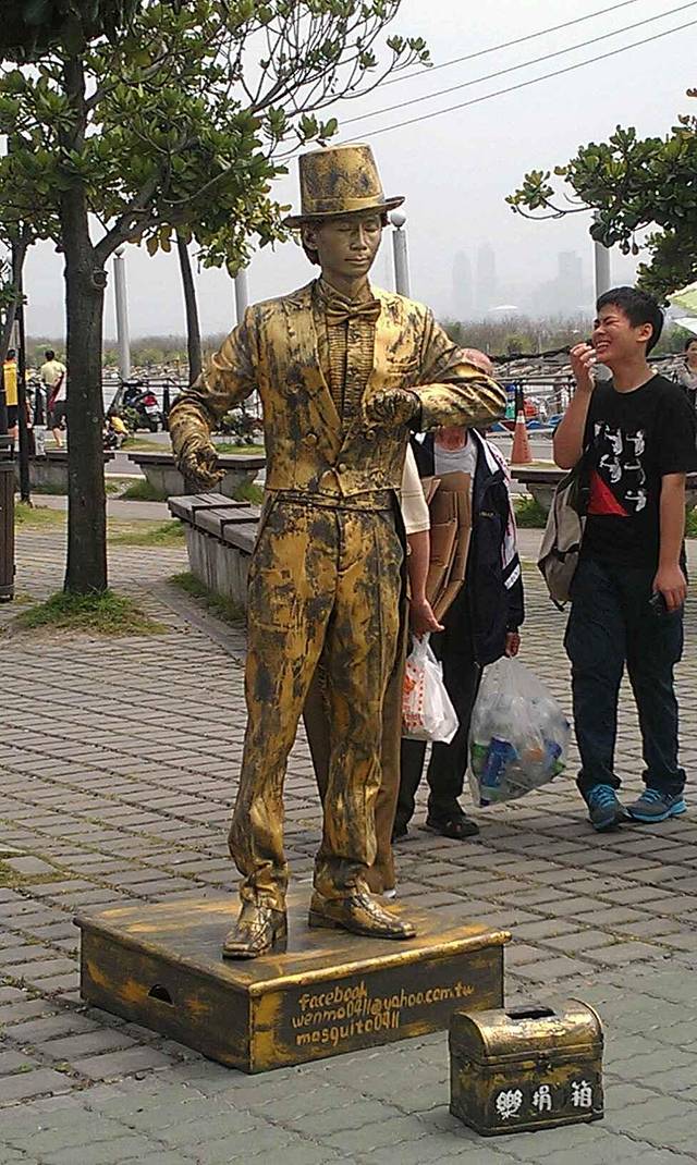 这个像雕塑一样的是真人哦~他很有意思,有人和他拍照,他就配合摆造型,不过拍完会搞小动作逗大家。天很热,他穿的很多,真的很敬业!