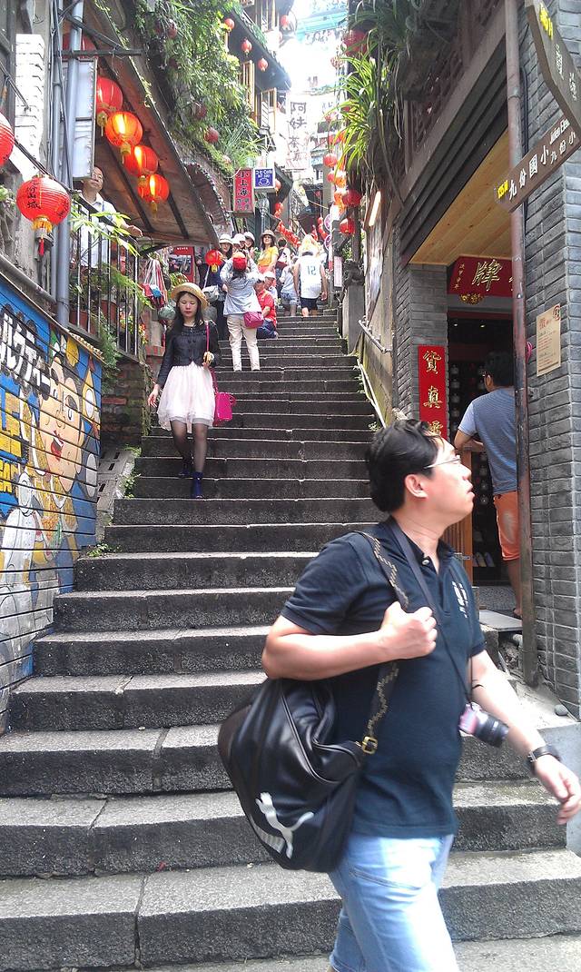 从饭店出门不远同样乘坐客运1062到九份老街下车,九份老街没什么特别的,印象中就是好多台阶好多的楼梯!但是风景还是很美的,而且依然还有很多美食可以品尝,PS:建议大家可以在这里买伴手礼很便宜,但是一定要准备好money,因为这里只有一家邮局可以取现,而且在山下,要走很远的路。九份看山景还是不错的,站在上面一览众山小的感觉真的很不错。