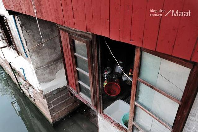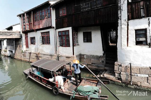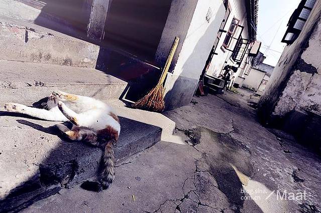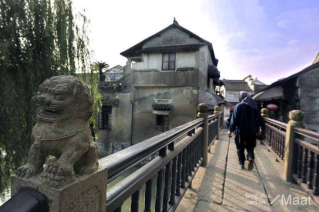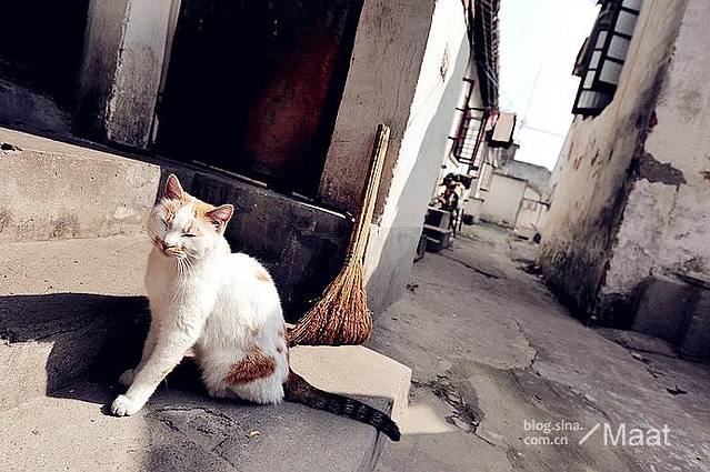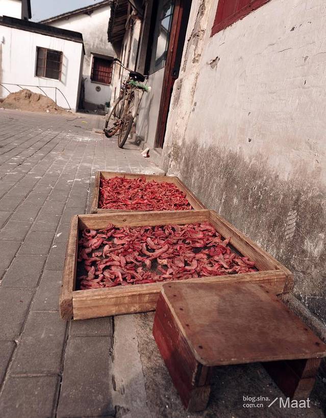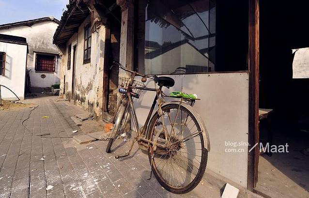 沿着一条路,走到了镇子深处。这里没有游客,只是锦溪人生活的地方。小巷悠长且幽静,房子显然比较破旧,但仍然有江南民居白墙黑瓦的风格;一个老人在一斧斧地劈柴,扑扑的声音回荡在小巷里;一只可爱的花猫跑过去,主人正端着一碗饭在招呼它;一条狗出现在我面前,看了看我,摇摇尾巴,大概表示欢迎吧,又回到墙角继续卧着晒太阳。河边,一个妇人在洗衣,另一个妇人则在晾晒萝卜干,旁边则是刚开始晾晒、菜叶还是绿色的霉干菜;一对夫妇摇着一条船过去,船上放着些河鱼和青菜;一个孩子正在吃力地推着自行车、驮着货物爬上小桥。这样的田园生活,于自己来说更有种置身其中的感觉,已不算是单纯的风景了...