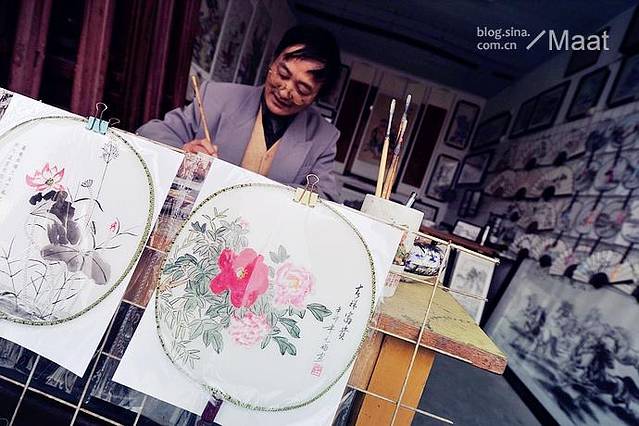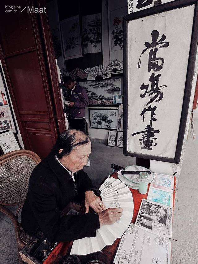 江南出才子,吟诗作画的能人异士太多了,这位老先生在镇上开的画摊,我走过去时他喊住了我,本以为他要推销他的扇子,谁知是要给我当场画一幅扇面,还热情的要我给他拍照。他的桌案上贴着他获得过的奖项,可爱的老人,是一个农民画家。现在,咱农民的才能可不容小觑哦~ 我非常喜欢下面那把团扇上的牡丹图,牡丹是我的最爱,本想在离开锦溪的时候买一把,却错过了。如果有谁去了可以帮我买一把吗? 如果不能了却心事那就预示着我会再赴一次锦溪之约啦~~~
