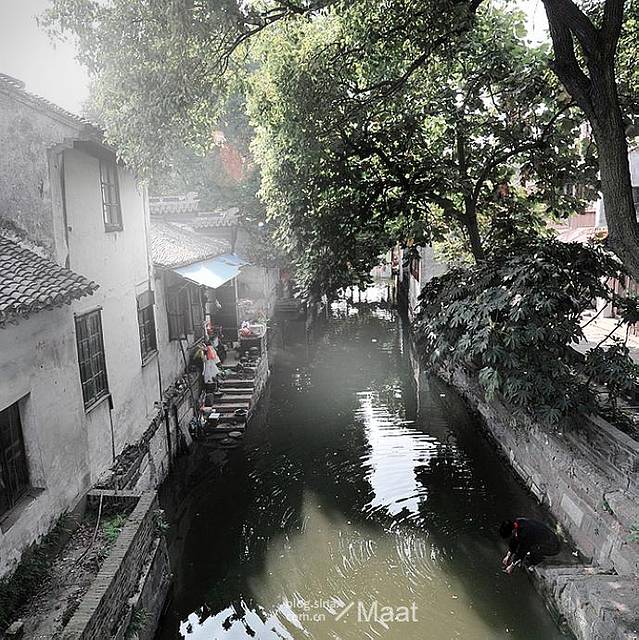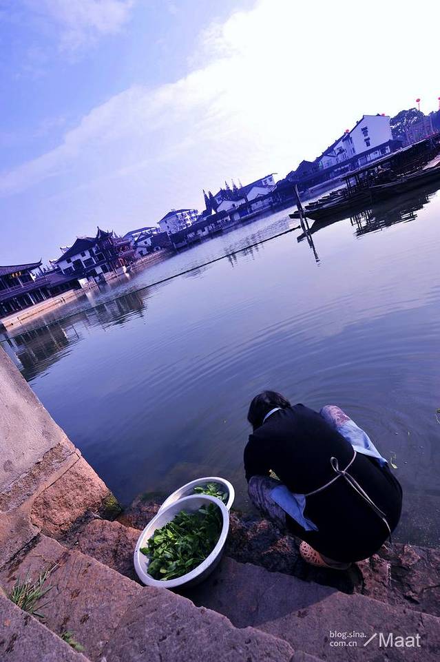 临水临街的家家户户,一望过去就可以见到极丰富的生活场景。 典型的水乡人家,通往洗菜、洗衣服的阶梯,我在这里蹲了好一会儿,其实我也不知道要干啥,本来是要蹲点等艘船摇过来结果变成了在那里吃喝一番玩了玩树叶子。 沿着青石板路上去,蓦然看见,这样的一个妇人在河边拿着一条大鱼正在剖洗,大约要准备午饭了罢? 桥下洗菜的大姐,我还静静的走过去拍了她的背影,我好担心吓到她。 锦溪的水质很好,没有污染,去过那么多的水乡,这里的水好干净,没有烂菜叶也没有游人扔的垃圾。
