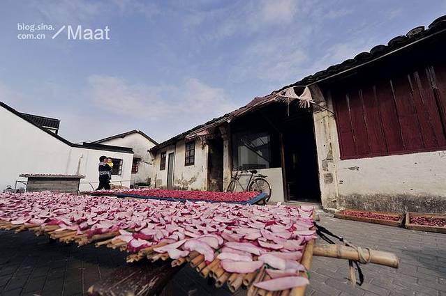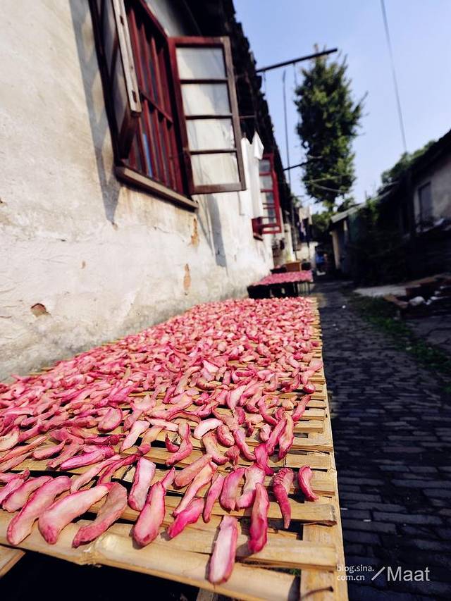 这种萝卜干,基本上随处走走就能看到,房前屋后晒得那叫一个灿烂。 红色的萝卜切了之后腌了再晒,看着就馋,我很想尝尝,就赖着不走一劲儿拍。估计门口的大妈看出了我的心思,就热情的说:你拿块儿尝尝,好吃呢~ 迫不及待的拿起来就塞,果然好味道啊~ 我边嚼边问:多少钱介个? 大妈淡定的说:呵呵,自己家晒了自己家吃的,不卖哦~~~ 真叫一个淳朴啊!