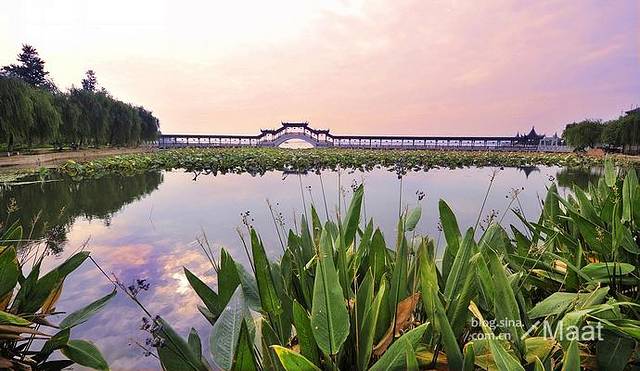 古镇入口处的大景,代表建筑――古莲桥,桥长长的,横在水中央,连接着陈妃水墓,中间是高高耸起的亭子,飞檐翘起,造型别致,阳光照过来,整个古莲桥就如镂空的剪纸一般,格外美丽。湖中是大片的荷花,晚秋初冬时节花不在了但叶子依然繁茂。不远处,便是莲花禅院,偶尔会有一阵阵悠悠的钟声从禅院里飘出来。