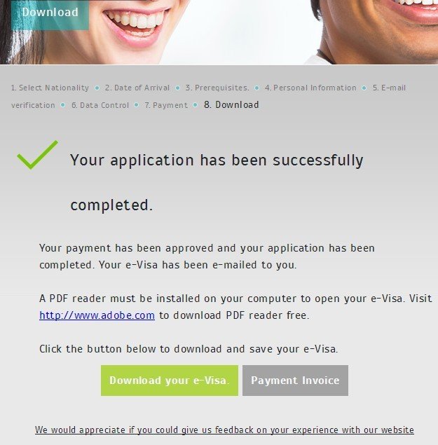 再继续就是跳转到验证邮箱的界面,进入自己填写的邮箱可以看到一封邮件,点击approve就认证了,如果没收到,看看是否在过滤邮箱里,或者点击申请页面的resend。之后进入支付页面,填写信用卡号,验证码和到期时间进行支付,页面会显示金额为20美元,支付后页面等几秒会显示成功并且出现download链接,并且页面显示电子签证申请成功,可以直接点击下载pdf,同时邮箱会收到一封邮件带有下载链接。