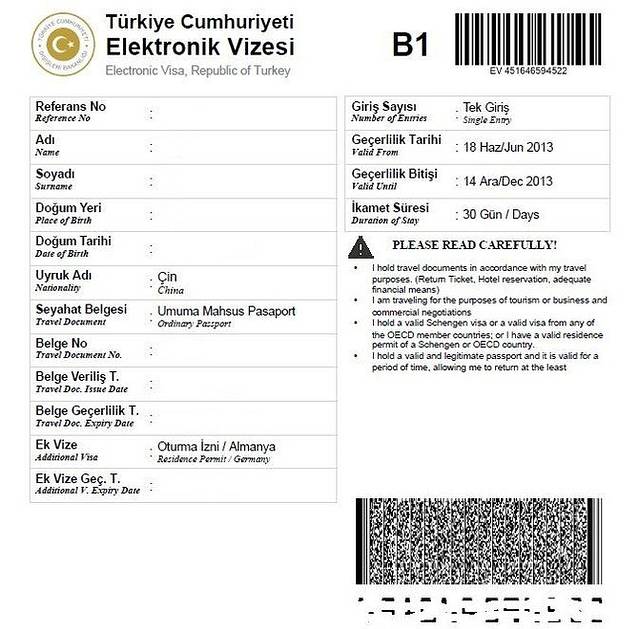 电子签证上就是显示个人的基本信息,也就是申请的时候填写的,如下,打印出来即可,个人信息已抹去。右下角的条形码不要折损,估计在土耳其入境和出境时会扫描。