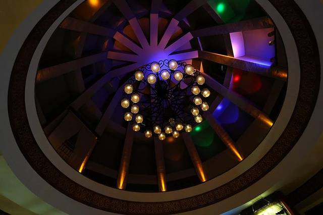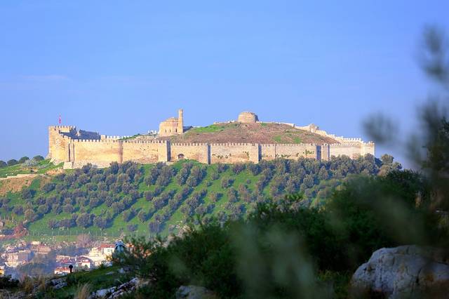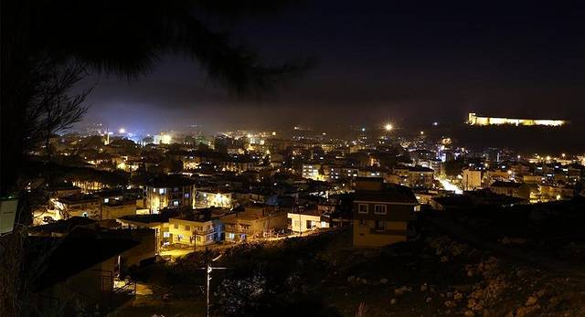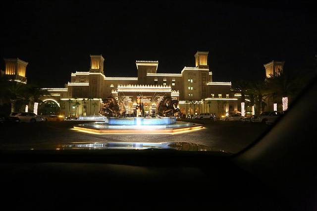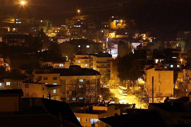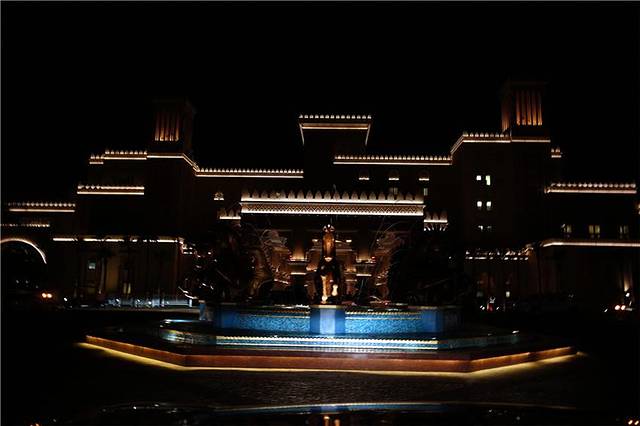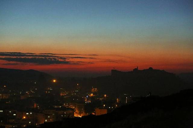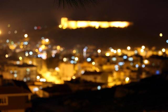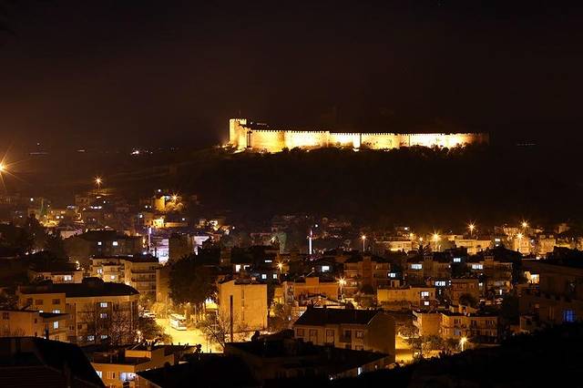 临时格雷梅小镇时,转过一个小弯,就看到这么个亮瞪瞪的建筑物出现在脑后,在深蓝的天幕下煞为壮观。 这就是著名的乌奇萨要塞。