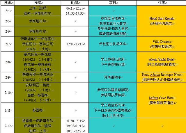 这是出发前做的行程表。到土耳其后除了因为飞机延误,以至于在迪拜多停留一天,占用伊斯坦布尔的一天行程外,在土耳其的行程基本上是按照上面的行程走的。