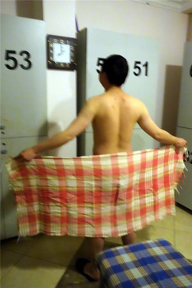 首先,就被带到大厅上涂脸,将一种绿色的膏状物涂在脸上;然后就上楼去桑拿房汗蒸了。