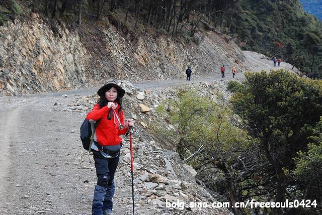 从上子梅村出来之后继续走一段下坡,经过一条河,然后便开始上坡路了。暖暖她们走得飞快,也不怎么照相。我们经常要停下来拍拍照,系系鞋带什么的,很快便又跟她们拉开了距离。听说贡嘎寺人满为患,想着好营地估计都让人给抢了,还好我们都不是特别挑剔的人,只要有个安全的地方能把帐篷扎下就行。