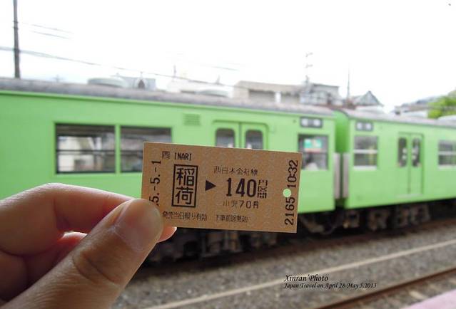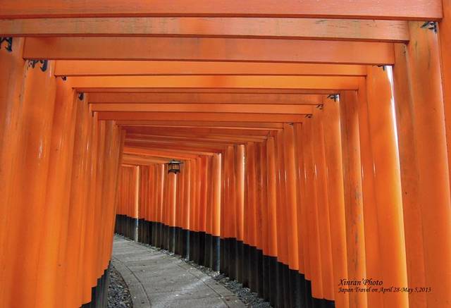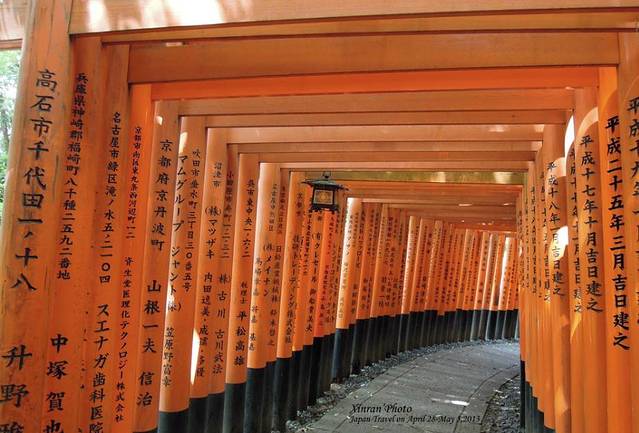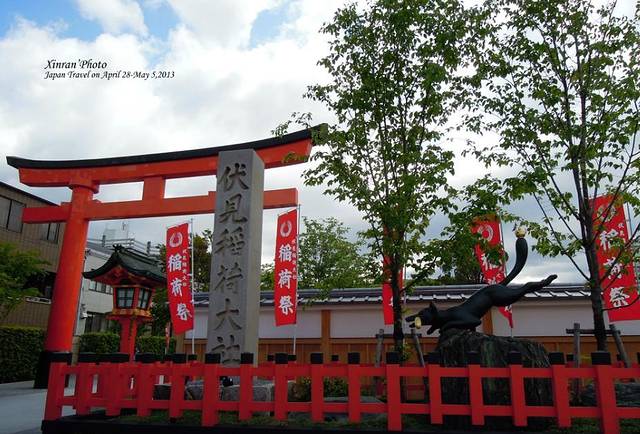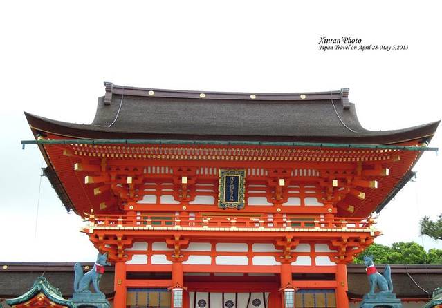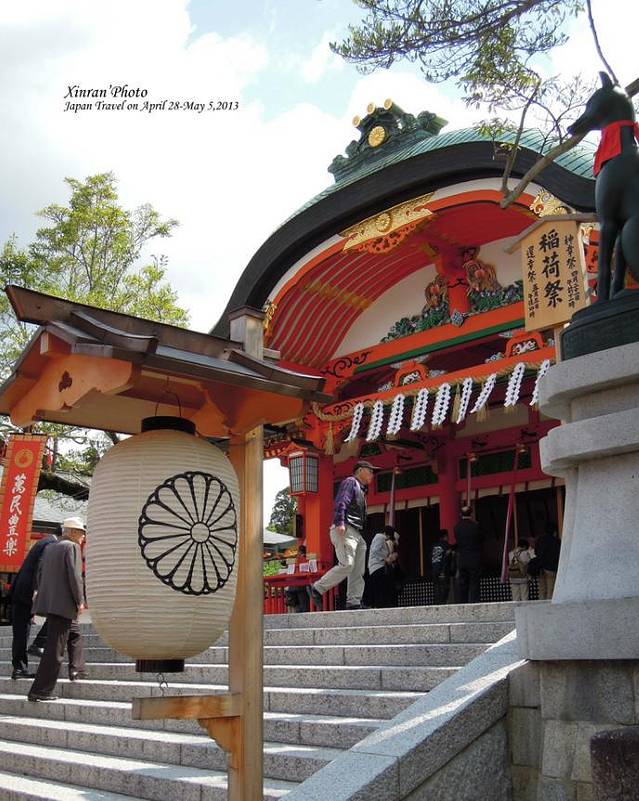 8:20 JR京奈线 京都——稻荷 熟门熟路了:),7-8分钟也到了伏见稻荷大社(第二站),和一些起早参拜、锻炼的老人们一起下车。 伏见稻荷大社是日本稻荷神社的总社本宫,也是最古老的神社之一。供奉的是生意兴隆、五谷丰登的神明,恰巧今天是1日,是赶集的日子,人很多。稻荷神社供奉的是狐狸,狐狸嘴里分别含有钥匙和宝珠,寓意着五谷丰登。神社前悬挂的灯笼可以看到该社的级别,这里的灯笼是菊花的图案,在日本菊花是天皇的象征,即神社是天皇级。大殿里正进行着法事,人皆着纱质白衣,头戴黑色高帽,很像棋魂里的佐为的服饰,表情肃穆,只有4个人身穿西服,像是在做什么见证。不敢拍摄,站在外面看了一会儿。