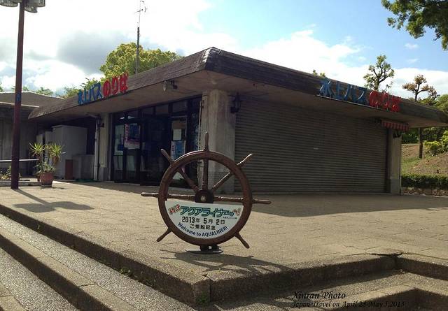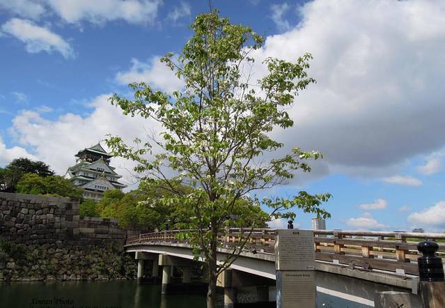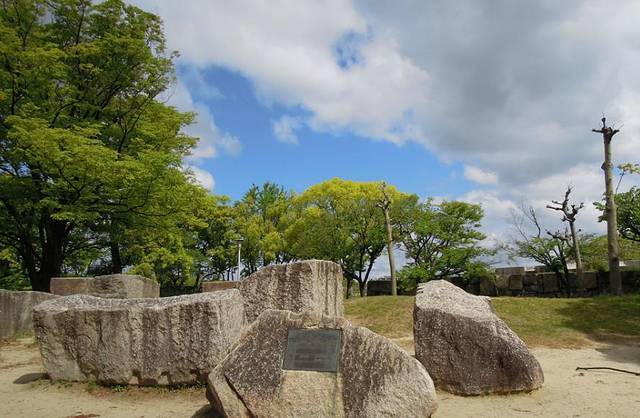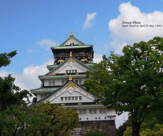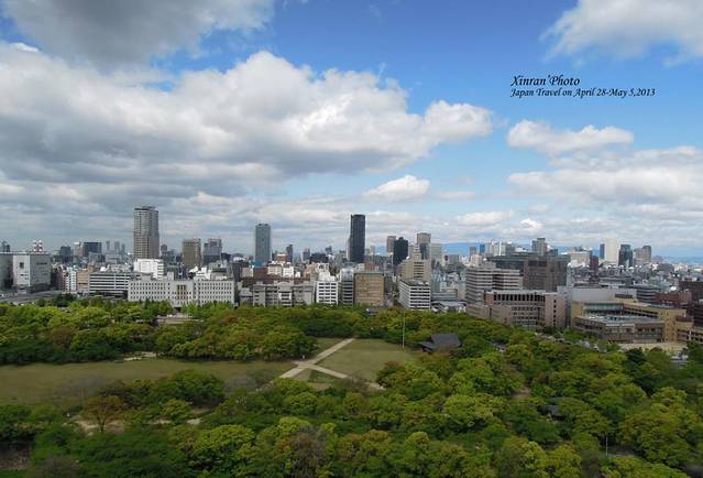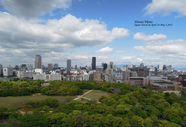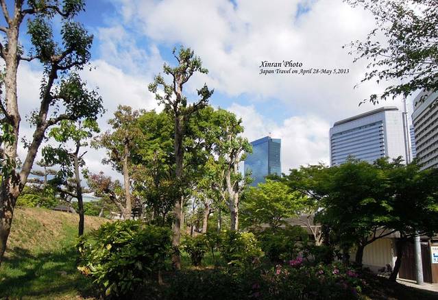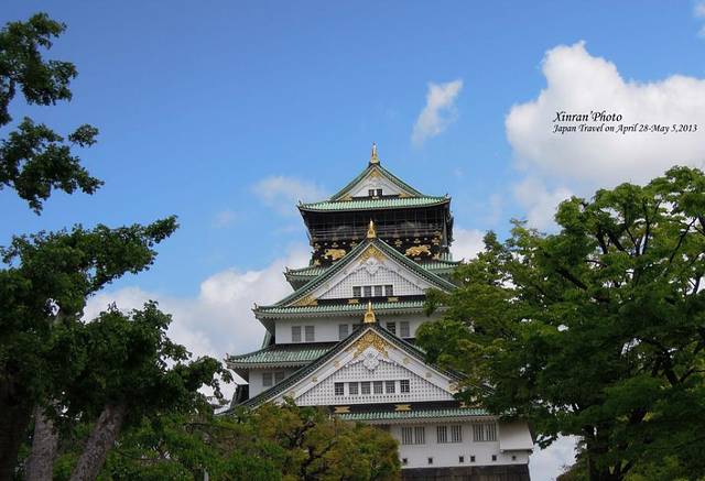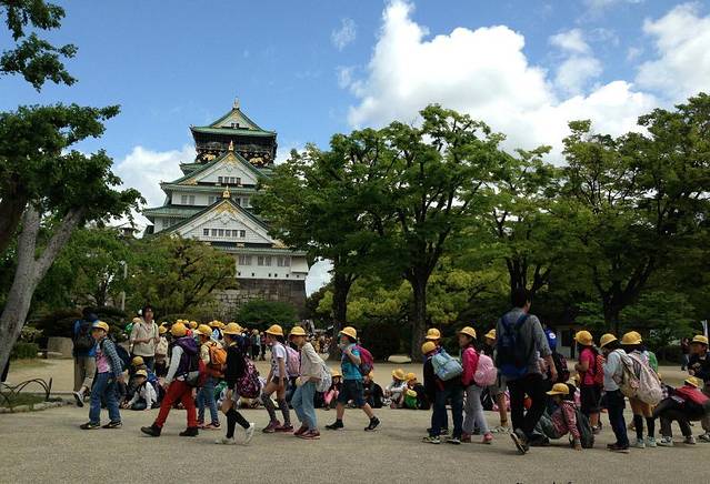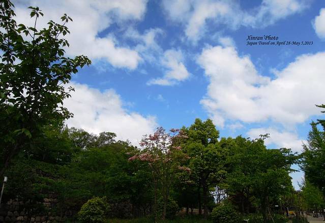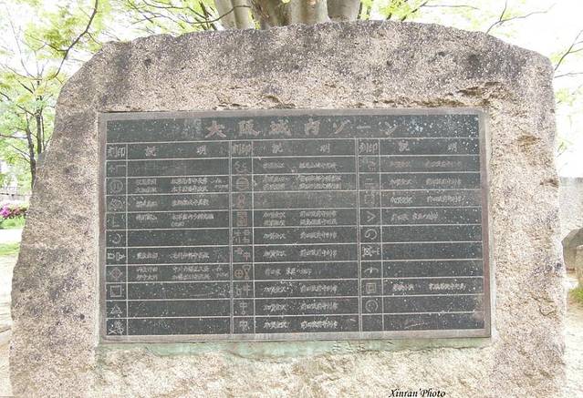 7:20 JR环线 梅田——大阪城 7:40 大阪城是完全开放的,入口就是一个中心是喷泉的广场。由于我们想坐水上巴士,售票是日本时间9:00,就在外面等了一会儿,在护城河边互相拍拍照,旁边有位扫地的大叔,放下扫把,很自然的走过来,示意帮我们拍了张合影!等到售票开门,卖票的女孩推荐我们乘11:00的那班船,这样2个小时玩大阪城足够了。沿着路往里走,可以看到大阪城的城墙,绿绿的护城河,以及天守阁,再应着格外给力的天气,令人心旷神怡!过了护城河,在城墙前有一片形态各异的石头,看看说明,貌似是奖励给战场上立功的将领,可以在石头上刻上他们的符号,好大的奖章!