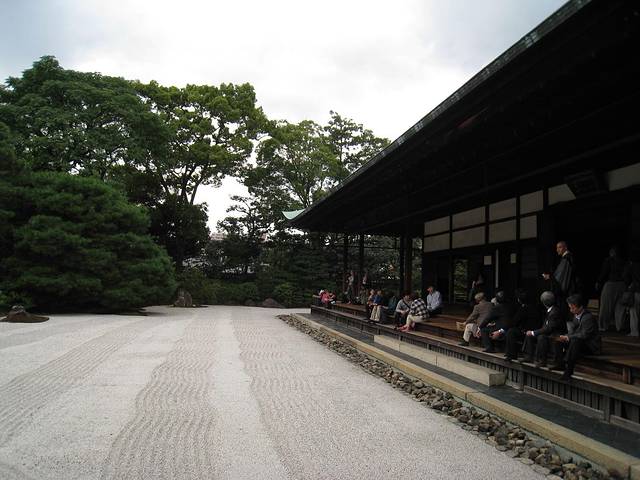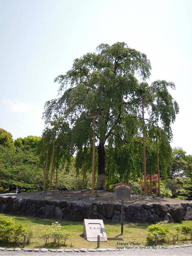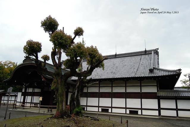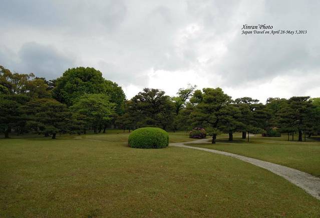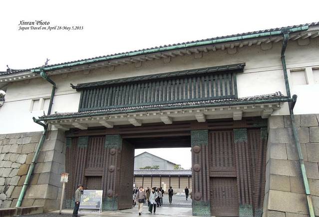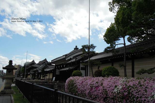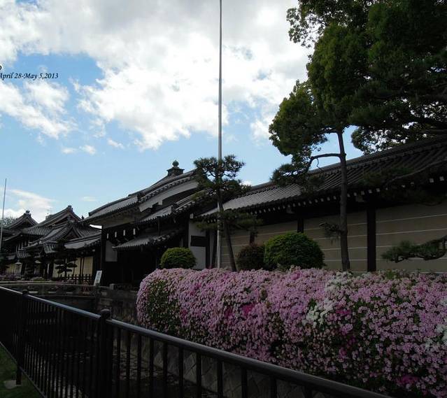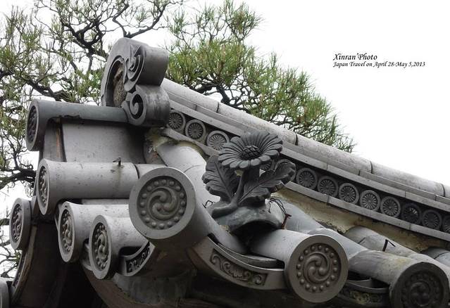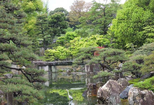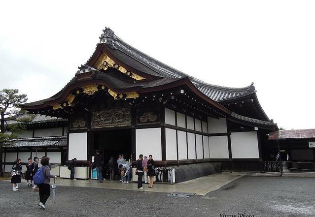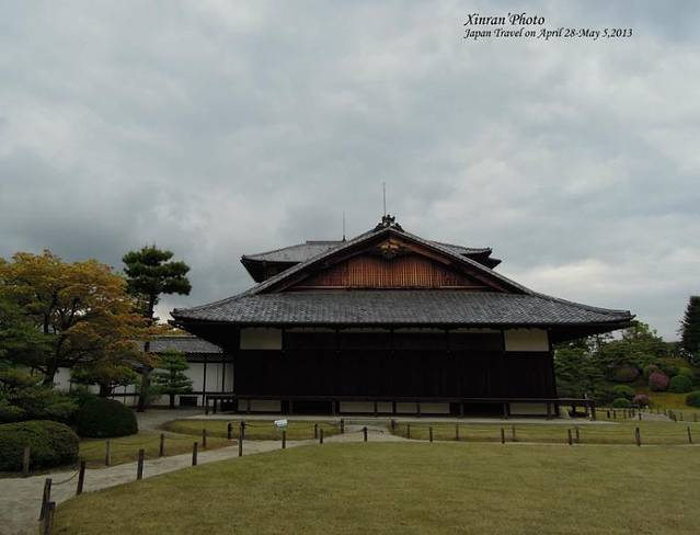 10:10到达二条城。 二条城是德川家康在京都建的行辕,类似于避暑山庄吧,唐代风格建筑,气势雄伟,当然这个气势和天朝是不能比的。游客比较多,我们租了中文讲解机,就进入了二之丸御殿,这里需要脱鞋,不能拍照,我们就顺着人流和标示走。地板踩上去很舒服,木制地板,缝隙间是用铁钉和黄金连接而成,人走在上面会发出黄莺般的声响,用来防御刺客的,就是有名的“骊鸣地板”!看到的是各式的房间,空荡荡的地板上放有草席,能够分辨出房间的用途的就是墙壁和隔门上猎野派画家的作品,松树、梅树、樱花、猛虎、松鹤等等,代表不同的身份。出了御殿就到了二之丸庭院,其为一回游式水庭院,园中为仙鹤池和放生池。