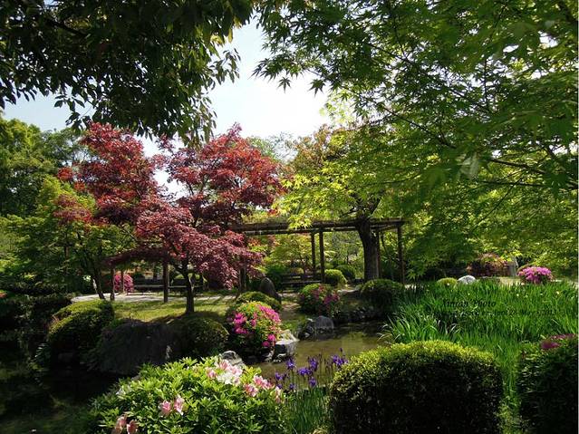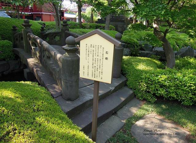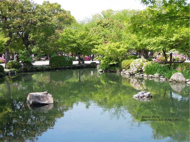一进门就看到了不二樱,好大的一棵樱花树啊!可惜已经过了樱花盛开的季节,不然满树的樱花一定很壮观!不二樱后面是个小花园,确实不大,但是处处是景,每个角度看来都很美,不禁让我想起苏州园林,猜想应该是从那里得到的构思吧,转过去发现这一洼池水是放生池,不少乌龟挤在石头上晒暖儿,惬意!