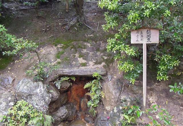 转过去很快就看到了闻名已久的金阁寺和镜面湖,从湖这边望过去是最好的视觉角度,金灿灿的,但不得不说阴天是一大败笔。绕湖半周就上山了,沿路可以看到义满公喝水或者洗手的地方。