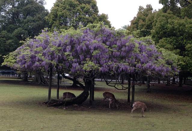 从春日大社出来,原路返回,为了赶车,我们决定乘公交返回奈良站。路过一片草地,几只鹿在一个开满花的紫藤树下休息,依稀记得有人说,以前认为紫藤是藤,到了日本才知道紫藤是树,其实是同一种植物,只是树状紫藤养护需要下功夫而已。由此看来日本人真是较真的民族。