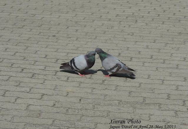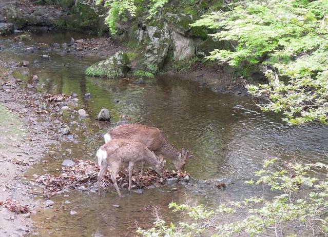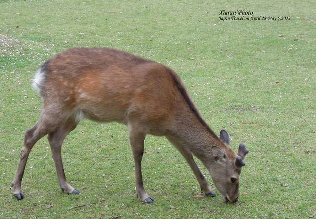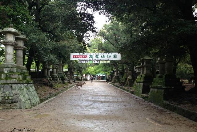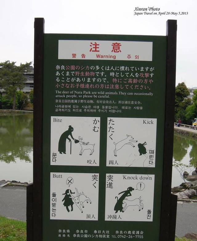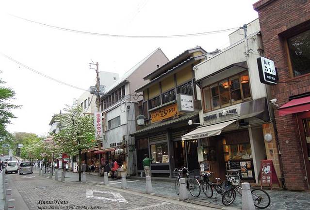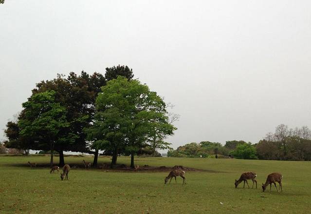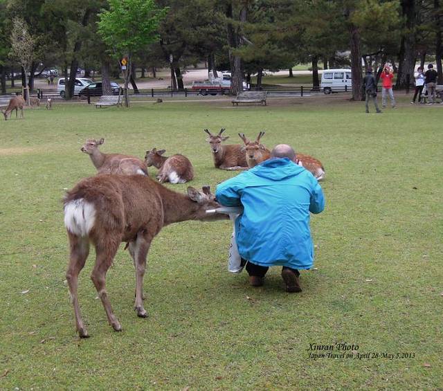 穿过一条商店林立的街道,虽然富有商业气息,但不喧闹,反而仍有一种平和的感觉,街并不宽,但有树木一行行,处处都是一道风景。街的尽头就是奈良公园,看到了防鹿冲撞的警示牌,就知道到地方了。作为曾经的古都,寺院还是很多的,三重塔和五重塔已不是我们关注的重点,看到一只鹿我们才兴奋起来。一只、两只、……越来越多,好了,我们停下来休息一会儿,和鹿合影,它们真的很友善,鹿很可爱,但很瘦,毛色不是很好,成年鹿刚刚剪去的鹿角提示着还是有人管理的,旁边还有一个兽医站,圈养着治疗中的鹿。之后,看到鹿自由的过马路,穿越栏杆,才知道原来它们才是这里的主人!!