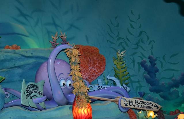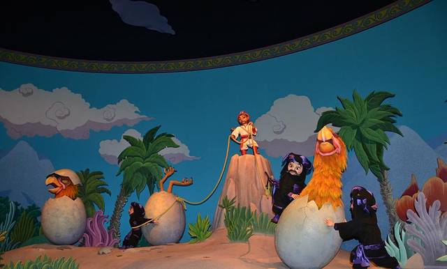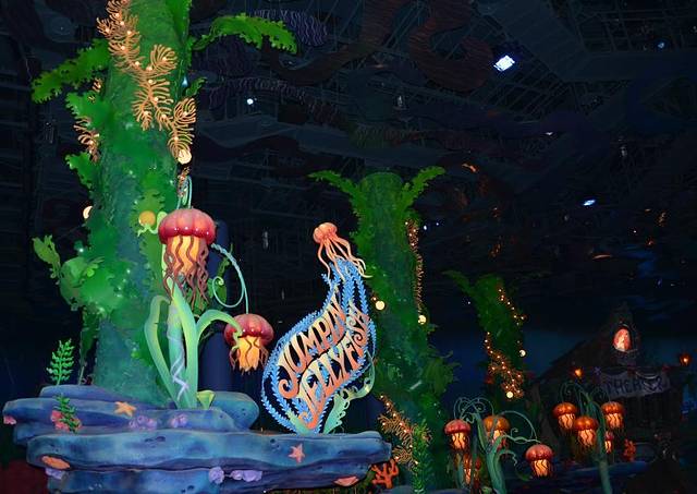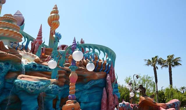出来之后就在神灯剧场排队,将近40分钟,每个需要等待的游乐在入口处都有一个米奇头的钟表,显示着需要排队的时间。神灯剧场是人和动画一起演出的3D剧场,同伴还找工作人员要了中文字幕屏,可以听懂演员的对话。观后怎么说呢?很适合小朋友们观看,听不懂对白没关系,也绝对看得明白。出了剧场,园区中心舞台表演活动,人都聚集在这里。我们就赶快撤了,买了米妮头的冰激凌,边走边吃。走到美人鱼礁湖,爱丽儿趴在那里,里面是个大城堡,海底国王带领着他的部下,有几个娱乐都是平稳安全适合小朋友的。出了美人鱼礁湖,我们穿过神秘岛、美国海滨出来了。鉴于赶上30周年庆不容易,肯定要买点纪念品回来,各式迪士尼的卡通人物做得都很可爱。