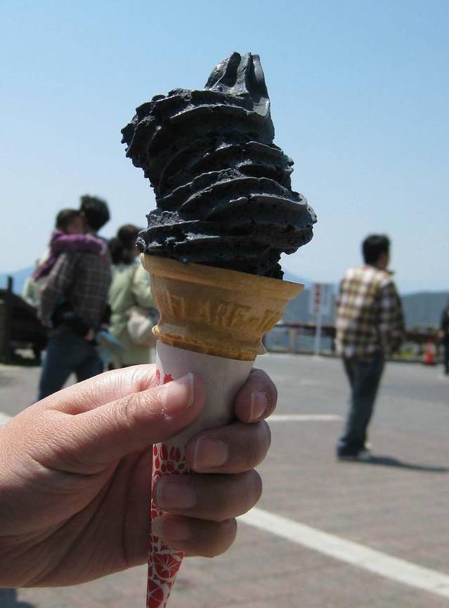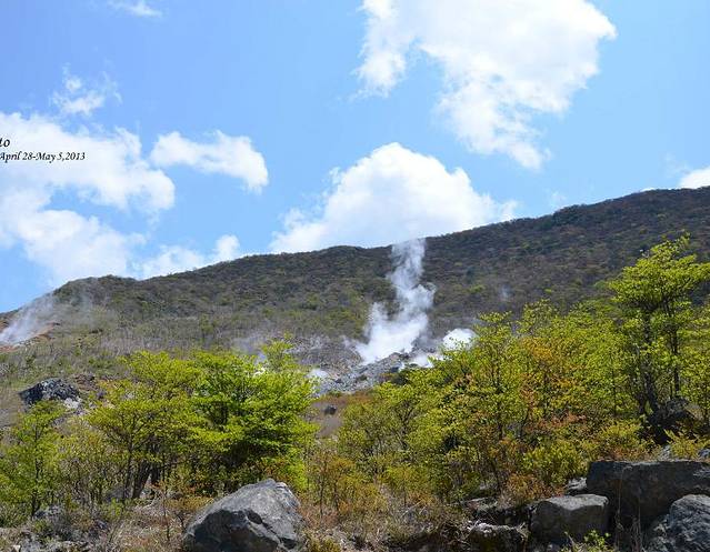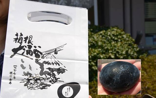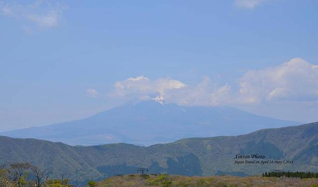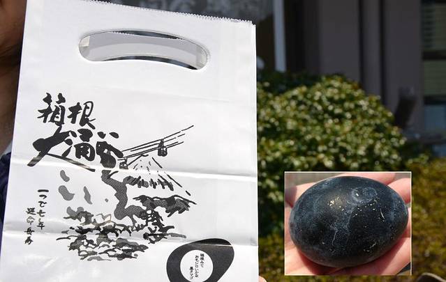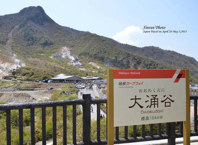 准备坐缆车去大涌谷。这时人还不多,小小的排了一会儿队,坐在缆车看就可以看到雾气腾腾的地热,先到姥子站,我们没有下车,继续坐到下一站,就是大涌谷了。大涌谷是大约40万年前箱根火山活动的末期,火山大喷发形成的火山口遗迹。聚集的游客非常多,随着人群我们往山上走,一路上都可以闻到硫磺的味道。在这里,就可以看到富士山了,但是不管哪个角度,总会有片云彩环绕的富士山的颈部,隐隐看到上面的积雪。到了大涌谷,怎么能不吃黑鸡蛋呢?500元5个,除了皮是黑色的以外,就是普通的鸡蛋了,但是很嫩,应该是纯天然无公害吧。另外,还有冰激凌,看着没有食欲,黑色的一坨,但吃起来……草莓味的,奶味很足,好吃!!!