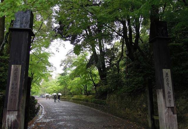 金阁寺,正式名为鹿苑寺,是一座济宗相国寺派的寺院,建于1397年,是作为足利义满的别墅而修建的,足利义满将军也就是《一休さん》里将军的原型了。通往金阁寺的大门是两排高大的树木,也就显现出这个寺院的历史。我们到的比较早,人还不是很多,有几个小学生由老师带着参观。买了门票400円,进去还是庭园式的园林,雨水打在上面,郁郁葱葱的,潮湿的空气,呼吸很清爽。
