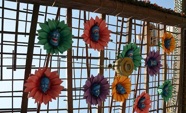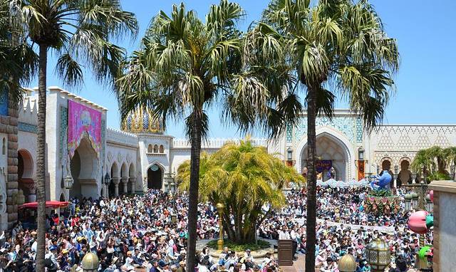 8:30 迪士尼 半小时就到达迪士尼,适逢东京迪士尼建园30周年庆。这样介绍东京迪士尼吧,分为两个园区——land和sea,land是全球最大的land,sea是全球唯一的sea,听起来就很有看头,再加上30周年,人肯定是非常多了。我们选择的是迪士尼海洋。先坐小火车入园,在海洋门口买票6200円,相当贵!海洋公园分为7大区域。第一个区域是地中海港湾,坐上渡轮可以绕园半周,路过神秘岛、美国海滨和发现港,在失落河三角洲下船。据说三角洲的项目都比较刺激,排队的人也比较多,我们就选择去阿拉伯海岸,不用排队就坐上了辛巴达传奇之旅,同伴说和香港迪士尼的小小世界差不多。
