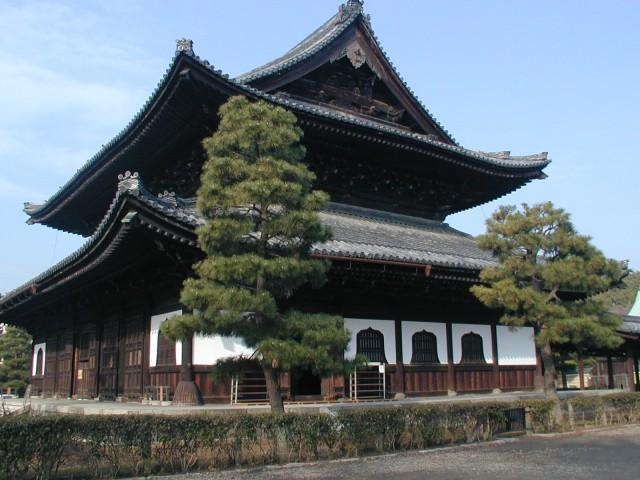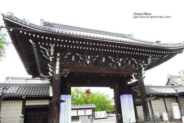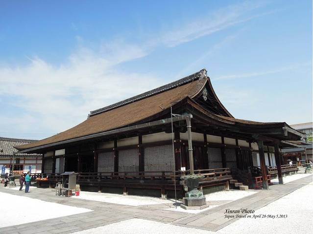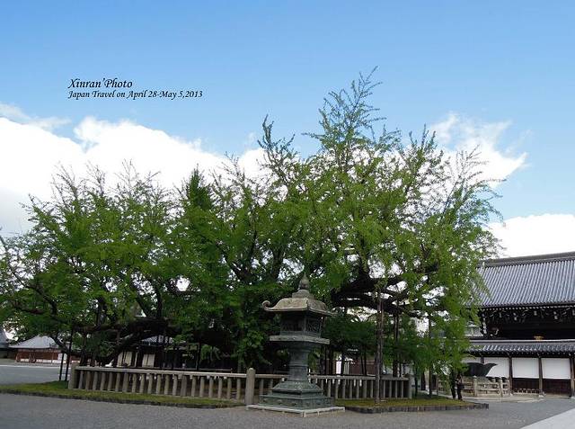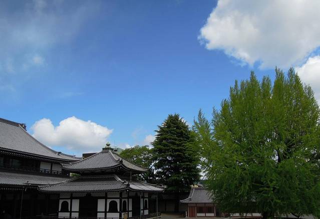 11:45 西本愿寺离京都站很近,步行就能到。天气真好,蓝天白云,好像当时北京已经30度了。 西本愿寺是净土真宗本愿寺派的总寺院,是京都最大的寺院。正门口好大一颗银杏树,莲花瓣水池。正殿也是需要脱鞋之后上去的,现在殿外转了一周,不得不说,木地板走上去真的很舒服,殿右侧看见一个人指着地板说话,等他们走了我过去看了看,原来是看地板补丁,好像富士山啊,还有葫芦形状的。正殿的各个门都可以进去,关好就行了,殿内庄严肃穆,有人在跪拜,有一个殿里供奉的是“见真”!朋友让我带新选组的纪念品,找了一圈没有,回去查了一下才知道,新选组是西本愿寺的污点,怎么可能还发售纪念品呢。