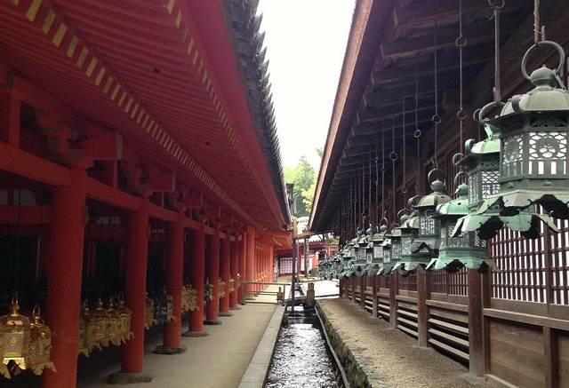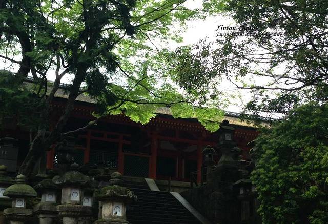 按照路标前往春日大社。此时已近黄昏,游客很少,周围是高大密集的树木,不时有鹿穿过,前面开阔处树木少了些,路边比比皆是布满青苔的长明灯,不禁想到了犬夜叉里的妖怪,有点寒毛耸立。春日大社门口供奉着神鹿,斑驳的青苔,口中流出的泉水,透着幽谧。但看到红漆的神社,顿时觉得心里平静了。春日山的春日大社建于和铜二年(710年),为当时的掌权者藤原家族的守护神而建造起来的神社,神社内也因藤而出名,是日本全国各处的春日大社的总部,与伊势神宫、石清水八幡宫一起被称为日本的三大神社。大门到主殿的距离很短,吸引我们的是主殿前悬挂的紫藤,开得正是时节。侧门旁有放置鸟居,古今对比鲜明。