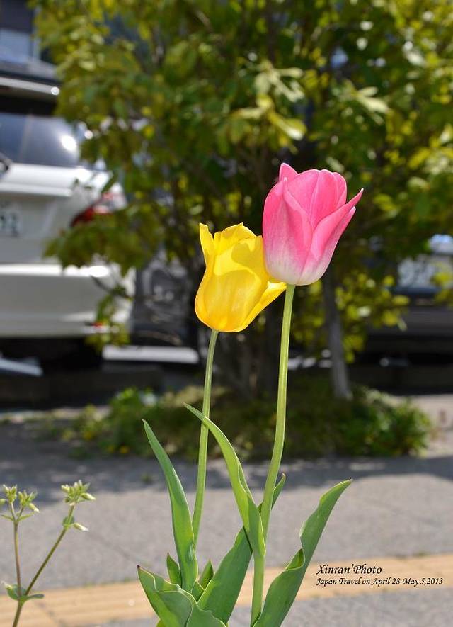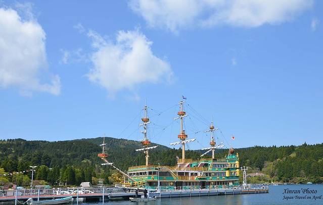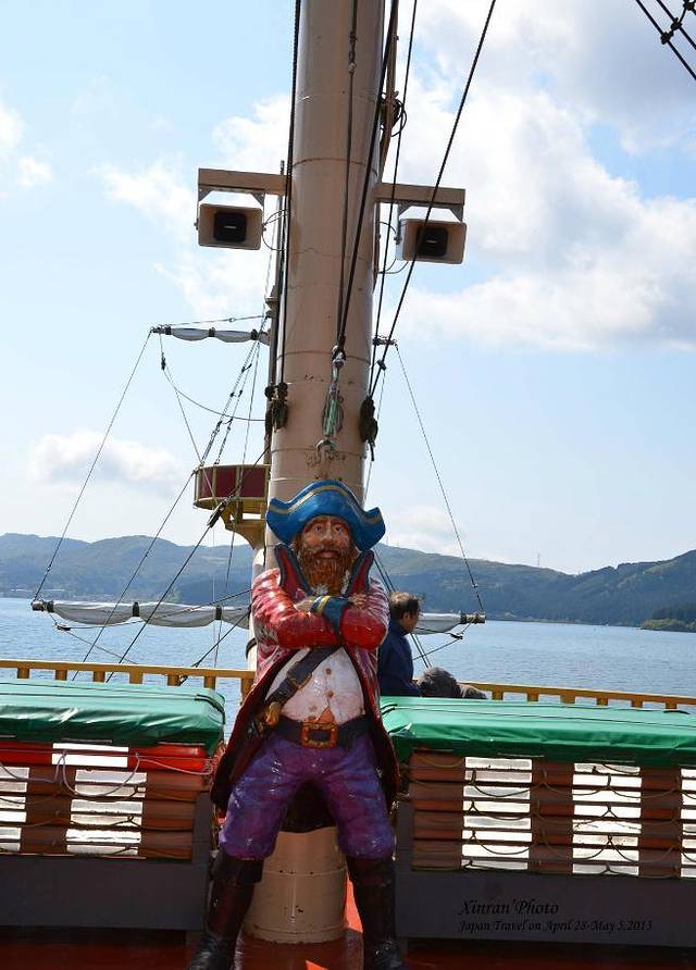 到了桃源台的游客中心,有种找到组织的感觉,人真多啊!不敢用自动售票,排队买了船票+缆车,2850/人,先去坐海盗船,游芦之湖。真的是花花绿绿的海盗船,很有感觉,船身很大,高高的桅杆上有个水手拿个单筒望远镜。天蓝水绿,很干净,有些微风拂面,很舒服。20分钟左右到对岸,下了船看到一艘大船要出发,是原路返回的,我们想还是环湖一周吧,就等10点那班船,随便在附近转了转,不敢走远。这里是仿瑞士建的小镇,有点欧洲的味道。有一个小邮局,可惜没有开。门前2支郁金香很漂亮。