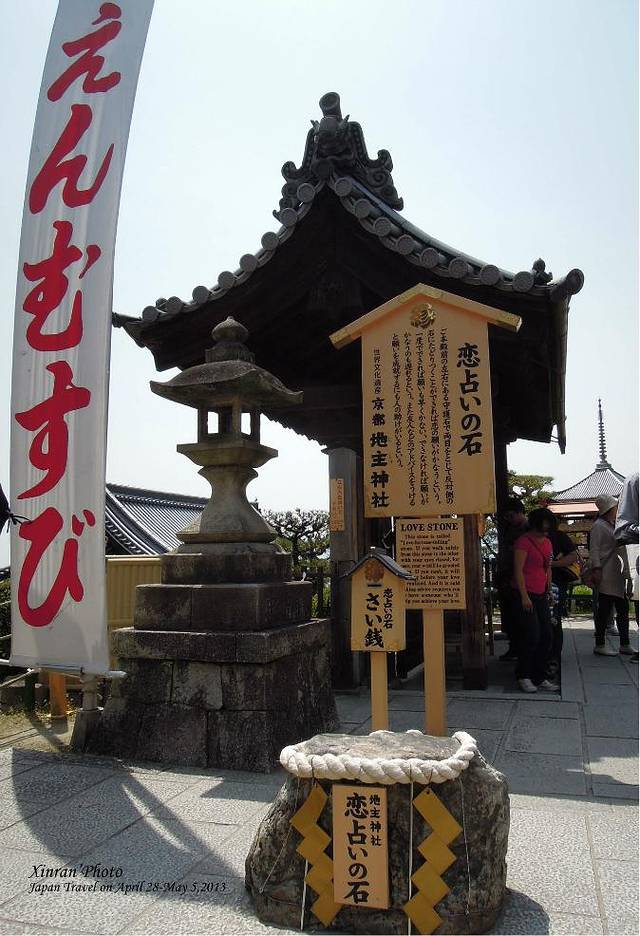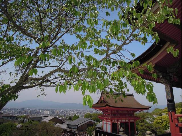 11:00 清水寺 清水寺也是为公元8世纪末所建造,为平安时代之代表建筑物,后来曾多次遭大火所焚毁,现今所见为1633年德川家光依原来建筑手法重建,清水寺因寺中清水而得名,顺着奥院的石阶而下便是音羽瀑布,清泉一分为三,分别代表长寿,健康,智慧。主堂是由139根立柱支撑的,宛如硕大的舞台,又称“清水舞台”。本堂的下方有著名的“音羽瀑布”,与祈求分娩顺利的“子安塔”,后者被列为世界文化遗产,清水寺建于音羽山上,为日本佛教北法相宗的总院。 人非常的多,我们没有在主堂过多停留,直接绕到旁边,从山上往下看去,可以看到京都城。旁边有求平安符和护身符的,抽了一支签,吉!当然,到这里肯定要求爱情和姻缘了。