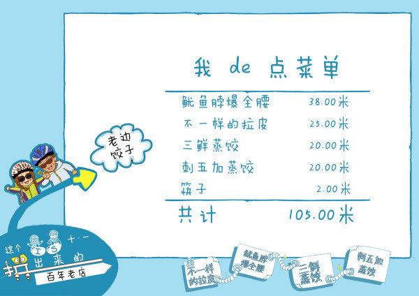 老边饺子至今已有160多年的历史,是沈阳最享盛名的风味餐馆,经营的饺子品类有100多种。著名相声演员侯宝林吃了老边饺子后,挥毫写下了“老边饺子,天下第一”的条幅。 是否名不虚传?我们今天要亲自体验一下~~只是这老边饺子真是火,排了小20分钟,才排到我们!对于老边饺子,也没做什么攻略~~ 他们的菜单很是人性化,热门菜旁边会有标记,方便客人点菜~~ 于是,三下五除二,我们就点好了!外表看上去和普通的饺子一样一样的! 不过咬下去,那就厉害了: 首先,会有少许汤汁留下来,鲜的感觉顿时迸发; 然后,你会不自觉滴想看一下馅料,恩恩,丰富非常,一看就是新鲜馅料; 味道嘛,自然不必说,好吃到家了!