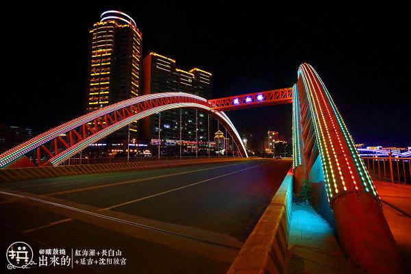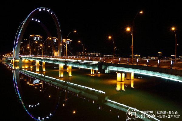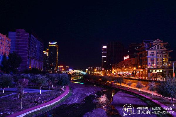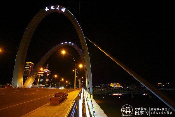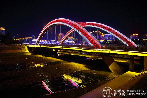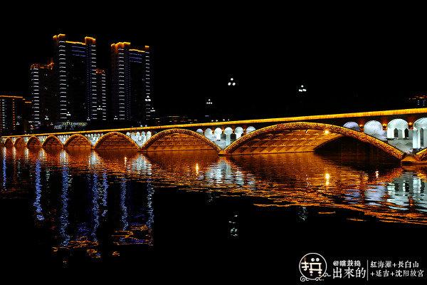 延吉的夜景,真的是美到爆! 白天看这些,你会觉得平平无奇; 要是晚上看,灯火辉煌,那真是漂亮的让你拍手叫好! 被这延虹桥吸引,斑驳变换着的颜色,让我们被诱惑着向它走去。 沿着布尔哈通河一直向西,两岸灯火通明。