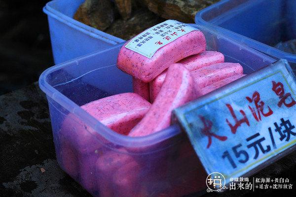 路上,不停地看到有人拿着鸡蛋吃! 哦!传说中的温泉鸡蛋哇!O(∩_∩)O哈哈~必须买个尝尝! 鸡蛋基本半生,一吸溜就干掉一个鸡蛋,这赶脚太爽了! (ps:长白山温泉鸡蛋:10元/3个,玉米:10元/2个。贵是吧?不过买了就当尝个鲜儿吧!)火山泥皂,15元/块 粉粉滴,不知道这用起来是什么赶脚?!
