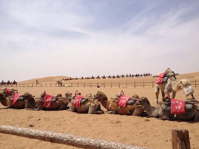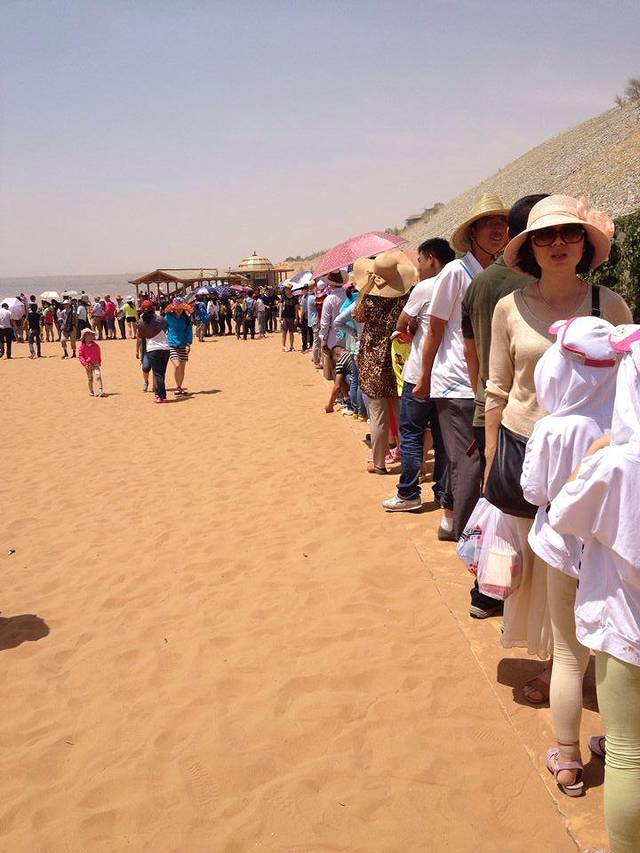 银川到中卫沙坡头挺远的,我们早上7:40从酒店出发,快十一点才到达目的地,这一天是温度最高的一天,而且我们这三个女汉子完全忘了防晒,只是简单的戴一个帽子,一天下来胳膊腿都晒黑至少两级,而且沙滩上特别烫,我们由于没看明白娱乐套票上面的游玩顺序外加赶时间,只能从沙坡上往下走,而我们三个年轻人都没有穿袜子,脚踩到沙子上烫的发疼,其中一个直接烫起来一个泡。第一张图片是排队在等玩滑沙,因为“爸爸去哪儿”在这里拍摄过,又因为这次是双节,这里的游客比去年多很多,四个小时的时间都玩不完套票上面的项目