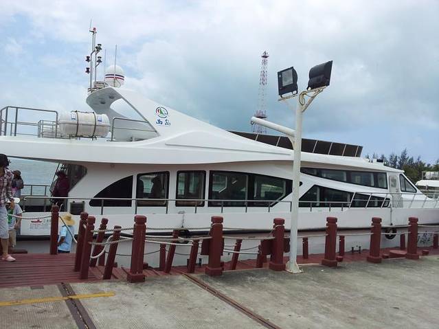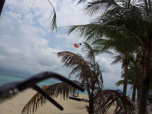 第二天早上起来去西岛,三亚的公交车好难等,在两个电三轮大妈的不懈跟随下,坐了她们的电三轮到西岛码头,说好10块钱一个车的,在听说我们买了票的情况下马上涨价到20,算了难得计较了,反正钱不多点。到窗口报名字取票后就去坐船了,上岛时坐的是那种小快艇,可以坐十个人左右吧,这快艇比较刺激,船头不断的向上翘起,还有点失重的感觉,很好玩,所有人都坐得挺开心的,个人感觉这就已经能值回西岛148的门票的。可惜回来就是大船了。。拖伞,很想去玩一次的,但看见飞得太高,有点怕怕,再加上当时排队的人有点多,就没玩,遗憾。